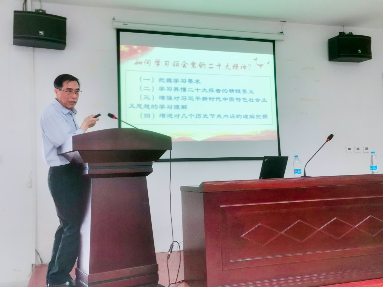 会议邀请校马克思主义学院杨邦勇教授作专题辅导报告。报告会上,杨邦勇教授以“如何学习领会党的二十大精神”为题,紧扣党的二十大精神的逻辑脉络和精神要义,从“把握学习要求、学深悟透党的二十大报告的精髓要义、增强对习近平新时代中国特色社会主义思想的学习理解和增进对几个时间节点时空历史背景的把握”四个方面,对如何深入学习领会党的二十大精神做了深刻阐述,并结合历史背景和丰富案例,引导与会人员学深悟透、准确理解党的二十大精神的精髓和要义。