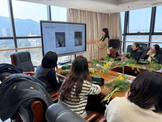 活动伊始,专业插花老师为大家讲解中式插花的起源与文化底蕴,带领大家领略传统花艺的雅致韵味。随后,老师细致讲解插花的造型设计、花材搭配、修剪技巧等注意事项,一步步拆解实操要点,为大家答疑解惑。