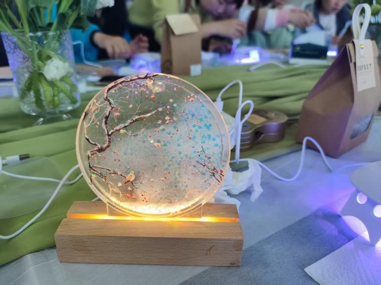 活动现场花香氤氲,笑语盈盈。专业指导老师首先讲解了流麻灯的主要款式、制作流程及注意事项。女老师们兴致盎然,从精心挑选材料、细致调试灯光、流沙油添加,到最终成型,每一步都凝聚着专注与创意。大家互相交流配色技巧、分享设计灵感,在协作中增进情谊。经过粘贴干花、创意封面后,一座座色彩缤纷、流光溢彩的流麻小夜灯惊艳亮相,承载着女职工们对生活的热爱与巧思。